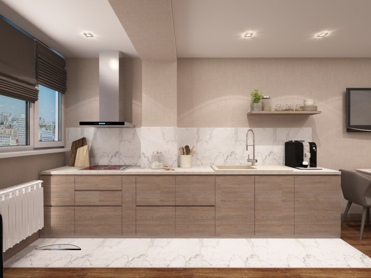 V bytě se nachází velká kuchyň, spojena s obývákem (přírodní ton + imitace dřeva dávají útulnost). Ložnice jsou vymalování ve stejných barvách. V bytě se nachází 2x koupelny, vyplnění v mírném tone. Použita krásná dlažba, napodobující reliéf kamene. Na obrázcích, představených můžete vidět designerský projekt a jeho realizace.